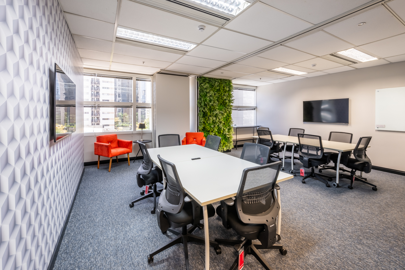 Mobiliada com internet, TV, cabo HDMI, câmera e quadro branco.