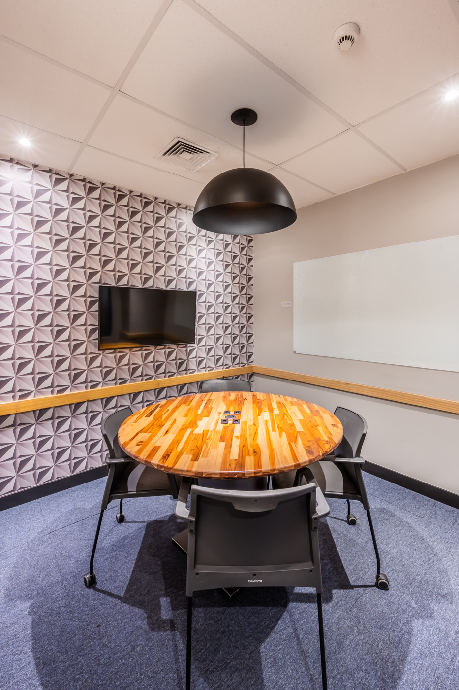 Sala mobiliada com internet, TV, cabo HDMI, câmera e quadro branco.