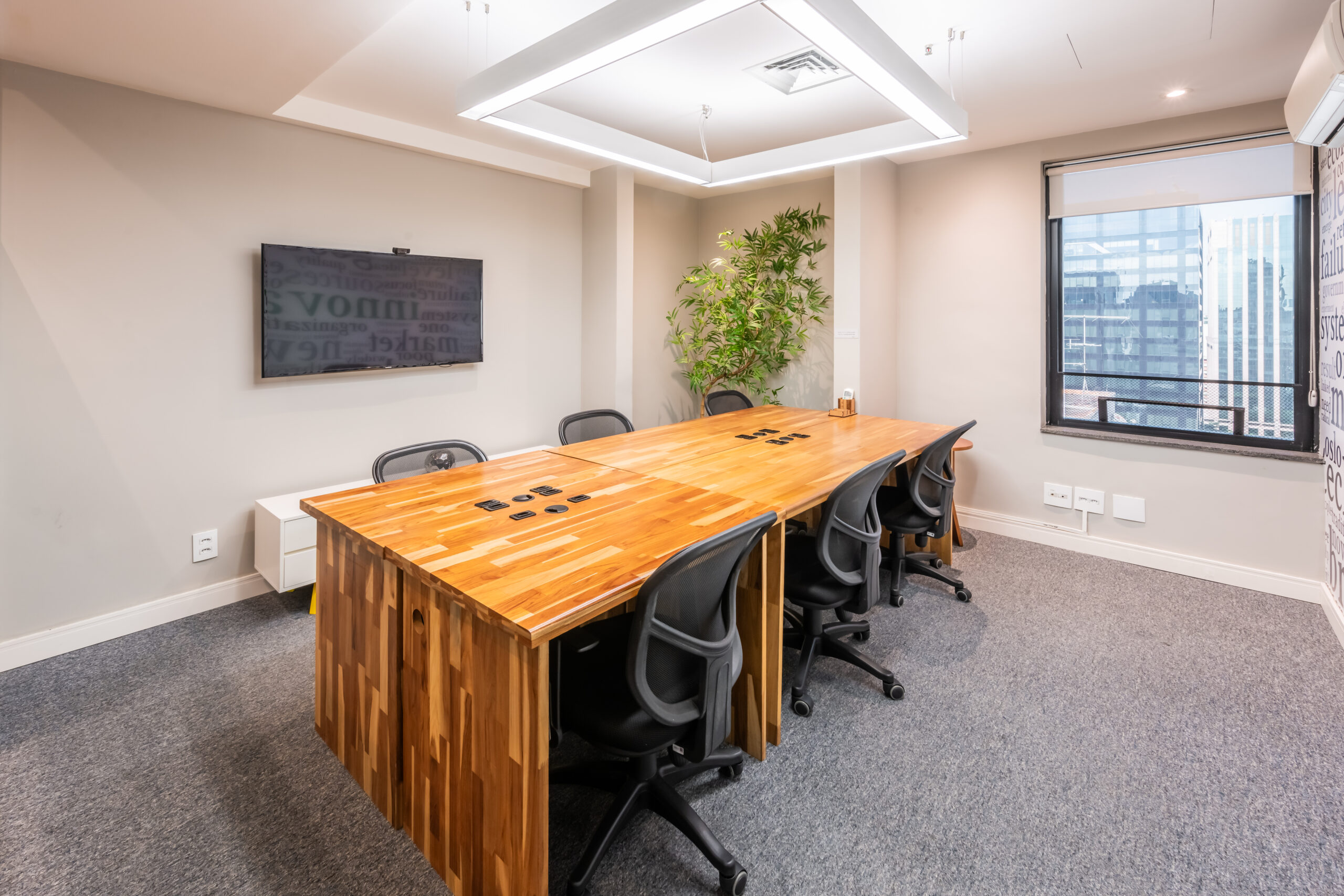 Sala mobiliada com internet, TV, cabo HDMI, câmera e quadro branco.