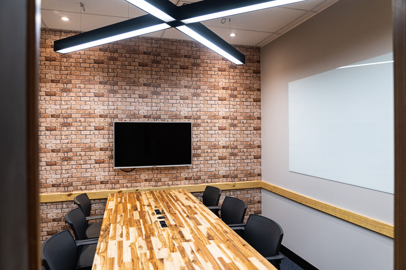 Sala mobiliada com internet, TV, cabo HDMI, câmera e quadro branco.