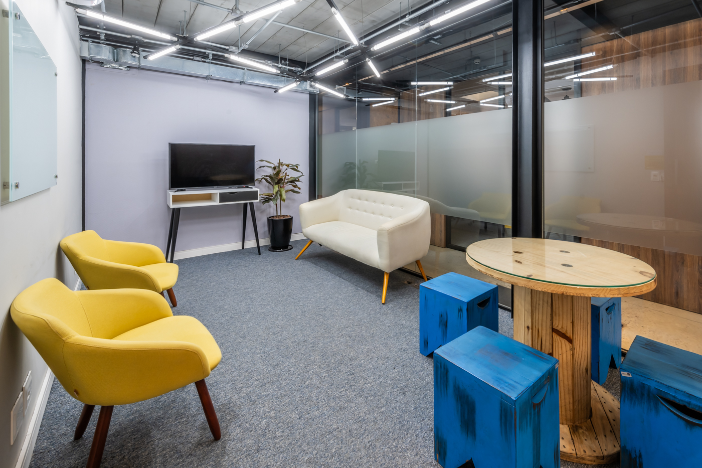 Sala mobiliada, com internet, TV, câmera, cabo HDMI e quadro branco.