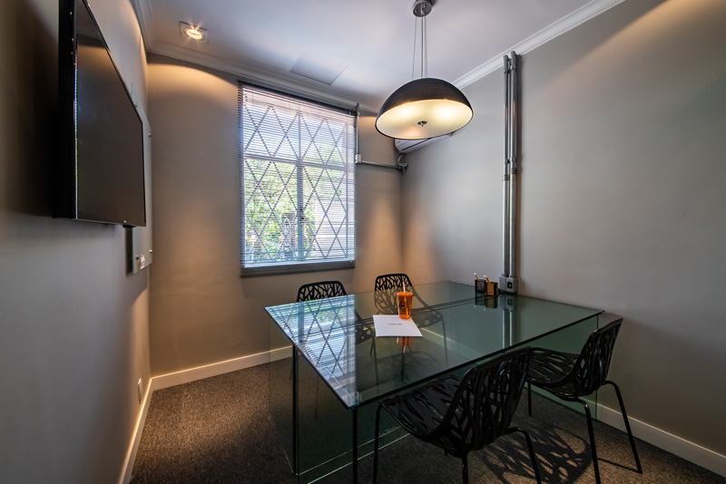 Sala mobiliada com internet, TV, cabo HDMI, câmera e quadro branco.