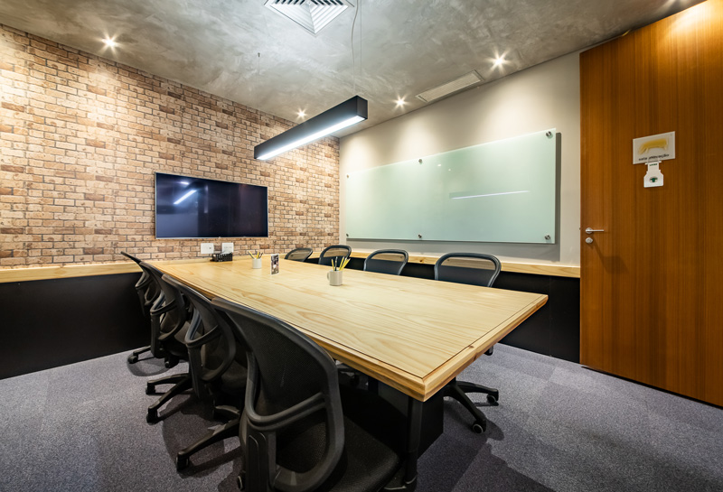 Sala mobiliada com internet, TV, cabo HDMI, câmera e quadro branco.