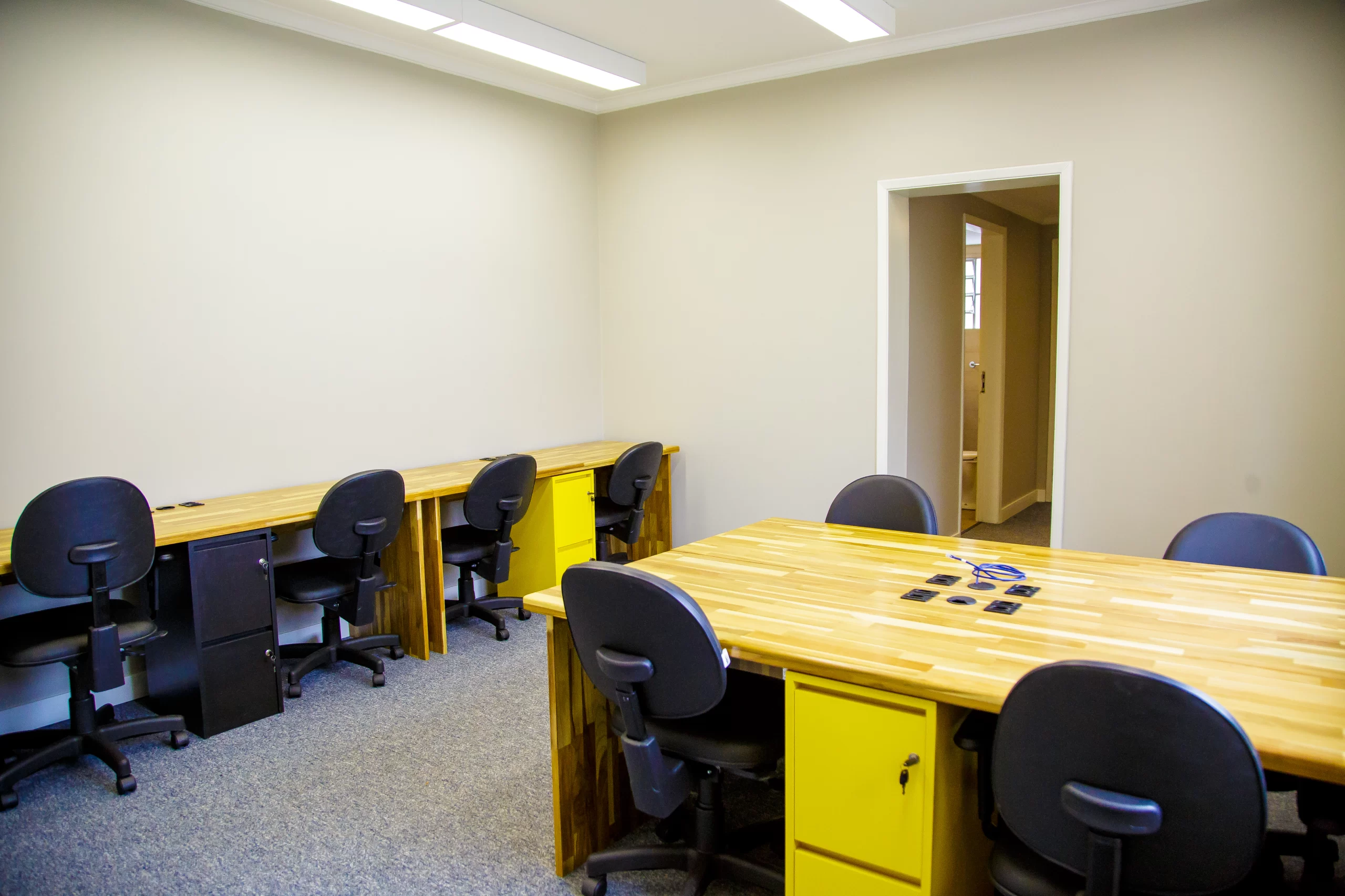 Sala de treinamento equipada com projetor, cadeiras universitárias e internet.