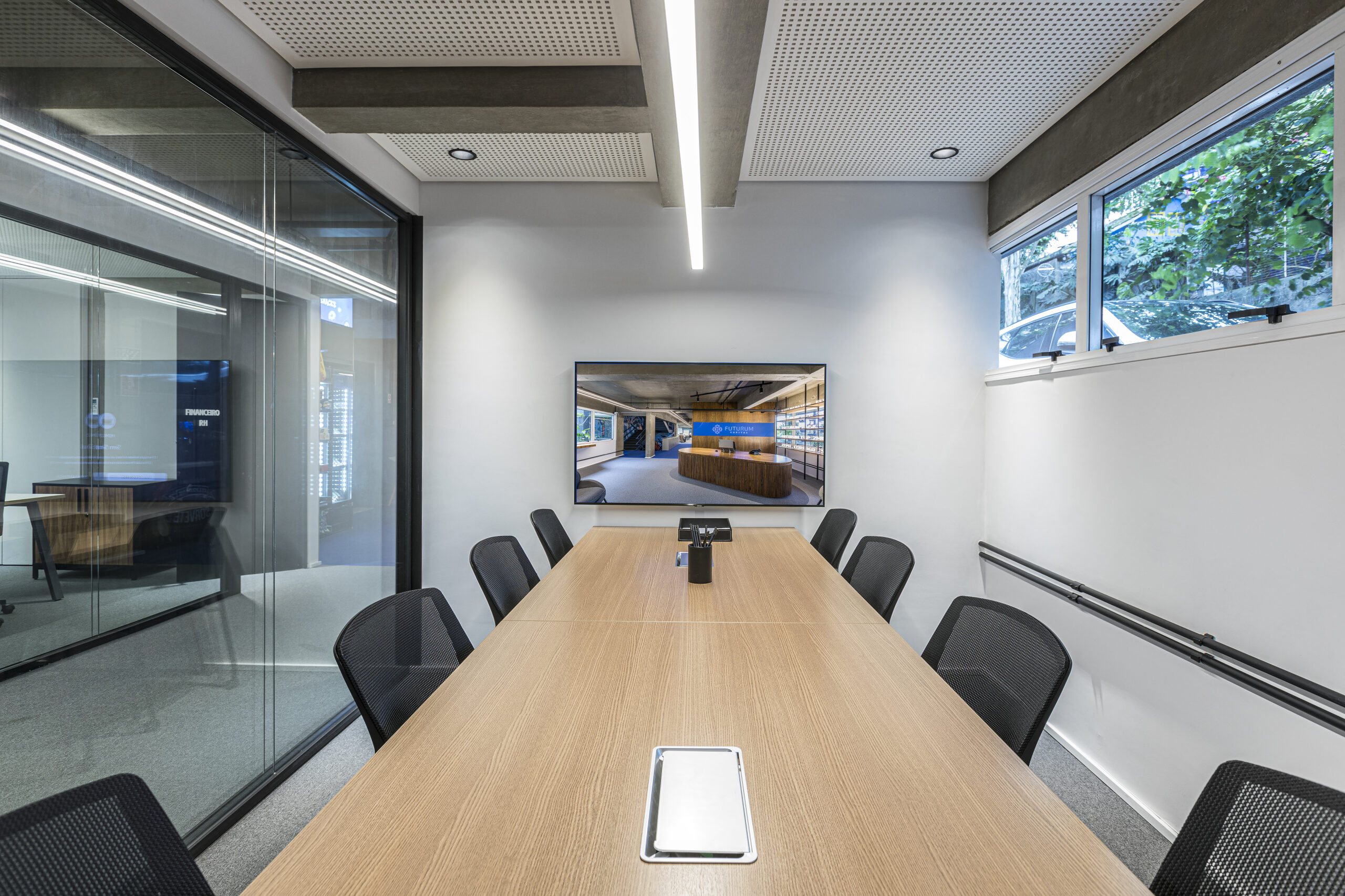 Sala mobiliada com internet, TV e cabo HDMI.